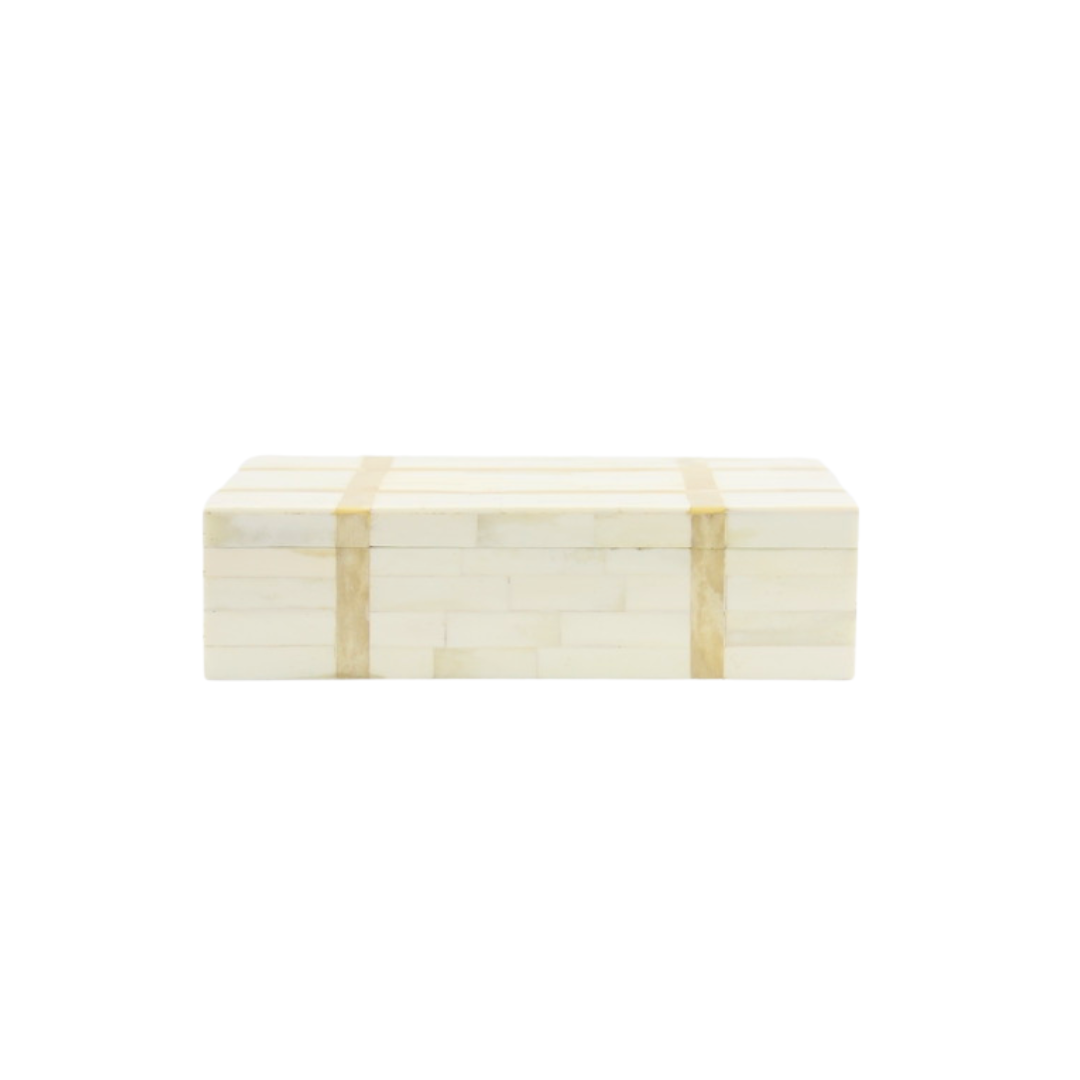 Equal parts elegant and artisanal, the Abilene Bone Box is a striking storage piece crafted from hand-cut bone and natural resin. Its soft, tonal palette and subtle striped pattern offer a quiet sophistication, making it as beautiful as it is functional. Whether styled on a console, tucked onto a shelf, or used to store keepsakes, the Abilene brings texture and intention to any space.