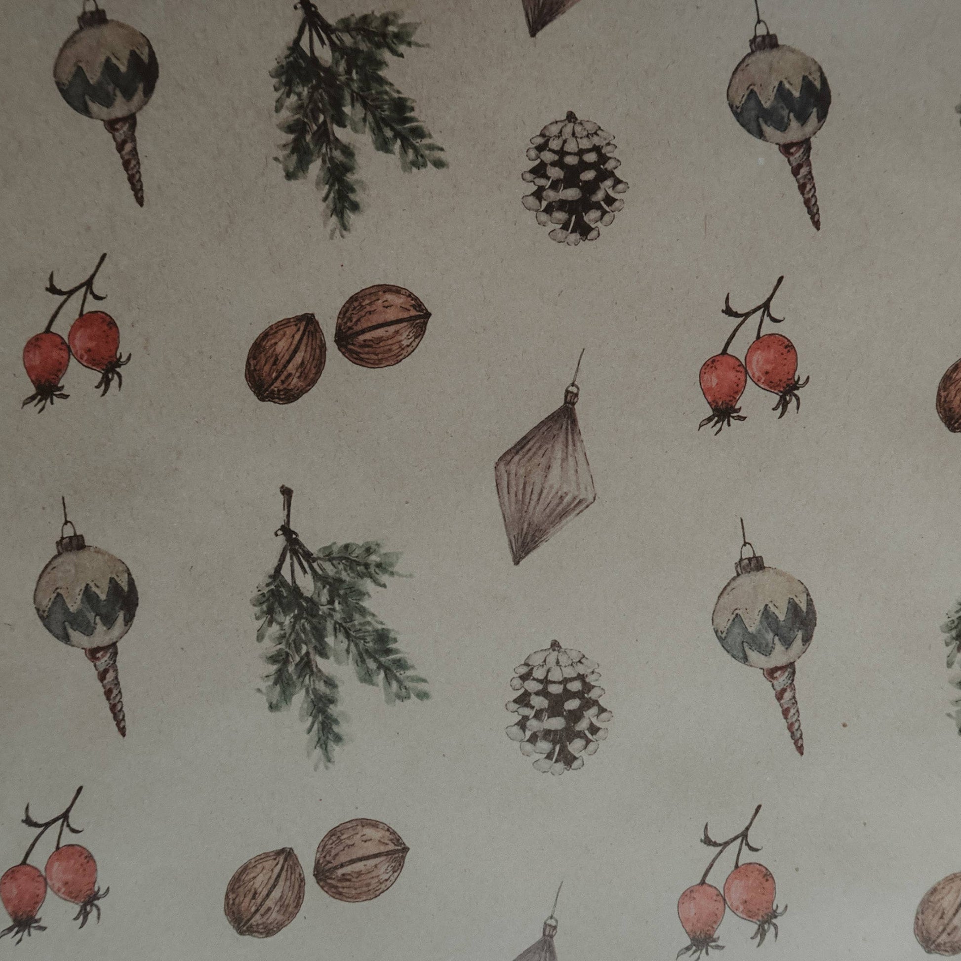 Celebrate the season with our Christmas Decor Wrapping Paper, printed on rustic kraft stock. Featuring an original watercolour design of classic holiday details — walnuts, vintage ornaments, pinecones, and winter berries — this paper captures the nostalgic beauty of Christmas. Perfect for pairing with velvet ribbons or twine, it turns every gift into something timeless and festive.