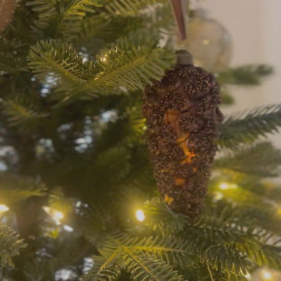 Add timeless elegance to your tree with our Pinecone Trio Glass Ornaments. This beautifully boxed set includes three glass pinecones in warm, complementary tones of gold, bronze, and champagne—each accented with subtle glitter for a refined festive shimmer.